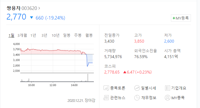 이에 따라 쌍용자동차 주가도 곤두박질 치고 있습니다.